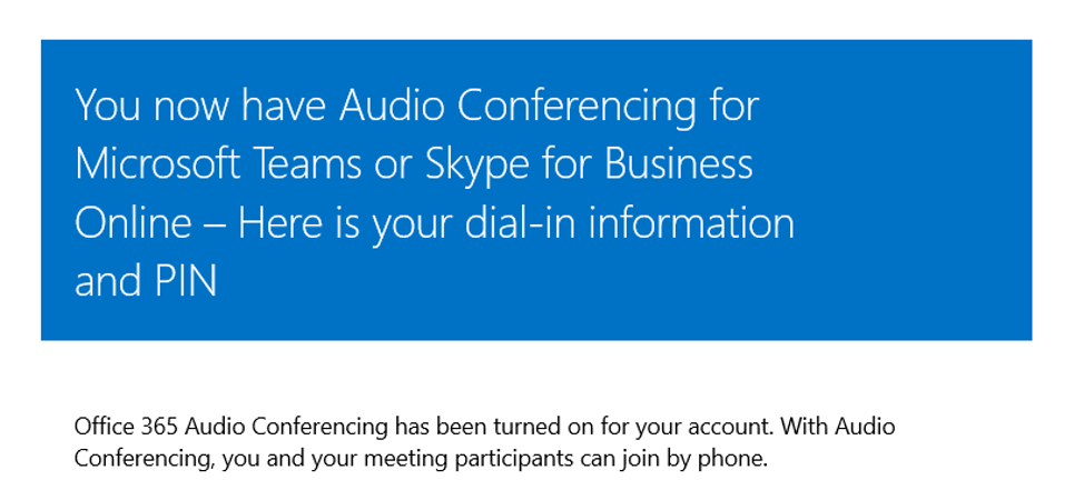 When first getting setup with Microsoft Teams Audio Conferencing you will receive an email from maccount@microsoft.com with your account information.