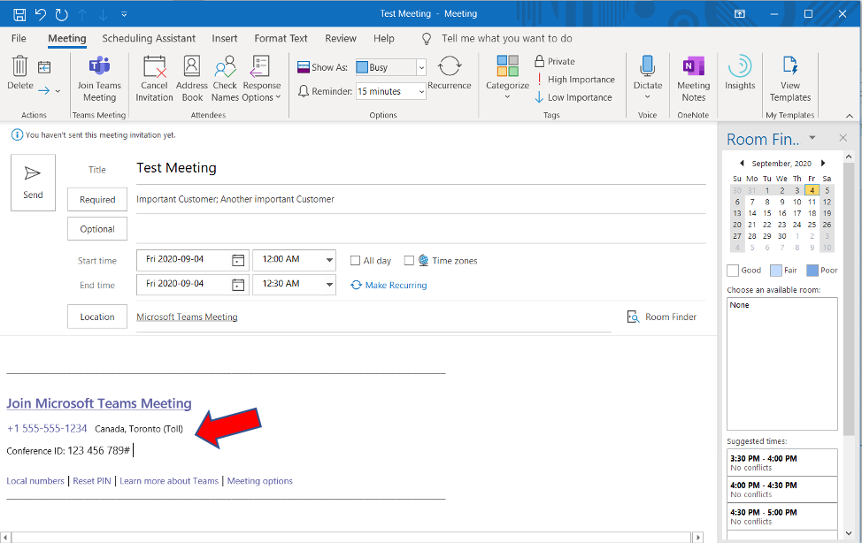 2. In the new meeting creation window, Microsoft Teams will now pre-populate the meeting dial in phone number and conference ID # that participants will need to know to be able to join the conference.